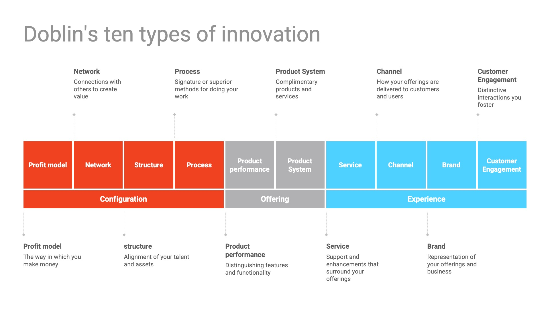 Een handig kader om dat scherp te krijgen zijn de 10 Types of Innovation van Doblin. Het maakt duidelijk dat innovatie veel breder is dan enkel “een nieuw product lanceren”.